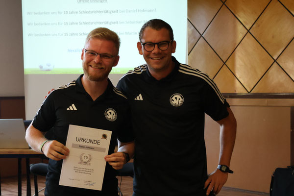 Umso erfreulicher war es, Daniel Hofmann nach vorne zu bitten. Daniel feierte 2024 sein 10-Jähriges Jubiläum. Zu dieser Veranstaltung durfte er diese Auszeichnung entgegennehmen.