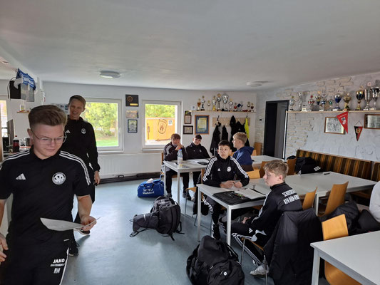 Nach der Regeneration, dem erneut gemeinsamen Mittagessen und weiteren Gruppenarbeiten neigte sich der Tag auch dem Ende zu. Mit einem abschließenden kleinen Regeltest, Konformitätstest und einem lockeren Kick in der Halle wurde vom Tag zwei im Champions Pub Resümee gezogen. Neben einigen natürlich alkoholfreien Getränken fand ein reger Erfahrungsaustausch einiger Teilnehmer statt.