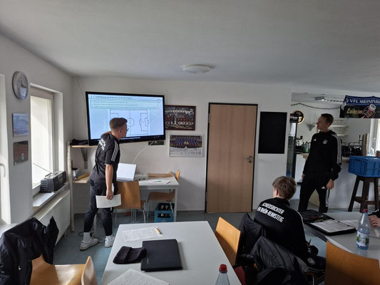 Danach fuhr die Coachinggruppe geschlossen zum Pokalspiel nach Untermaßfeld, bei dem die Mannschaft aus Brotterode-Trusetal zu Gast war. Das Besondere an diesem Spiel war, dass es unter der Leitung von Coachinggruppenmitgliedern, nämlich Noah Meißmer als Schiedsrichter, sowie Malte Günther und Sascha Dressel als SR-Assistenten, stand. Während des Spiels hatten die übrigen CG-Mitglieder die Aufgabe, auf das Lauf- und Stellungsspiel von Noah zu achten und sowohl positive, als auch negative Situationen zu dokumentieren. Gleichzeitig wurde das Spiel vom KSO offiziell beobachtet. Nach dem Spiel fand eine sehr ausführliche und präzise Auswertung vom KSO statt. Alles in allem hatte Noah mit seinem Team das Spiel souverän über die Bühne bekommen. Gerade das Lauf- und Stellungsspiel war unter Ausnahme von wenigen Schönheitsfehlern ein Spiegelbild von dem, was Jan am Vormittag vorgetragen hatte.